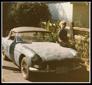derelict '67 MGB after pulling it out of someone's garage with his dad and